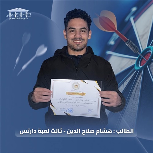 تتقدم الأكاديمية الحديثة (قسم نظم المعلومات) بخالص التهنئة للطالب/ هشام صلاح الدين (بالفرقة الثالثة)، بمناسبة حصوله على المركز الثالث في بطولة الـ Darts (لعبة السهام).