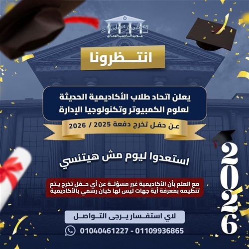 بيعلن اتحاد طلاب "الأكاديمية الحديثة لعلوم الكمبيوتر وتكنولوجيا الإدارة" عن تنظيم حفل تخرج دفعة 2025/2026. يوم مش مجرد حفلة، ده تتويج لكل التعب والسهر اللي فات.