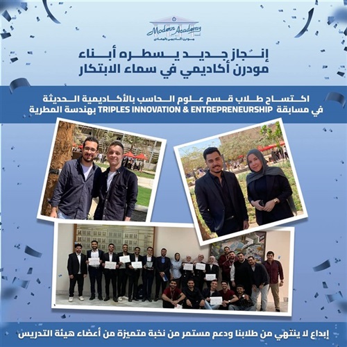 بكل فخر واعتزاز، نعلن عن اكتساح طلاب قسم علوم الحاسب بالأكاديمية الحديثة في مسابقة "TripleS Innovation & Entrepreneurship" بهندسة المطرية.