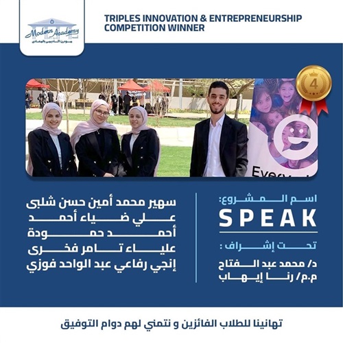 كل التحية والتقدير لفريق مشروع SPEAK لحصولهم على المركز الرابع وسط منافسة شرسة في مسابقة TripleS. مجهود جبار وفكرة متميزة تستحق كل تقدير.